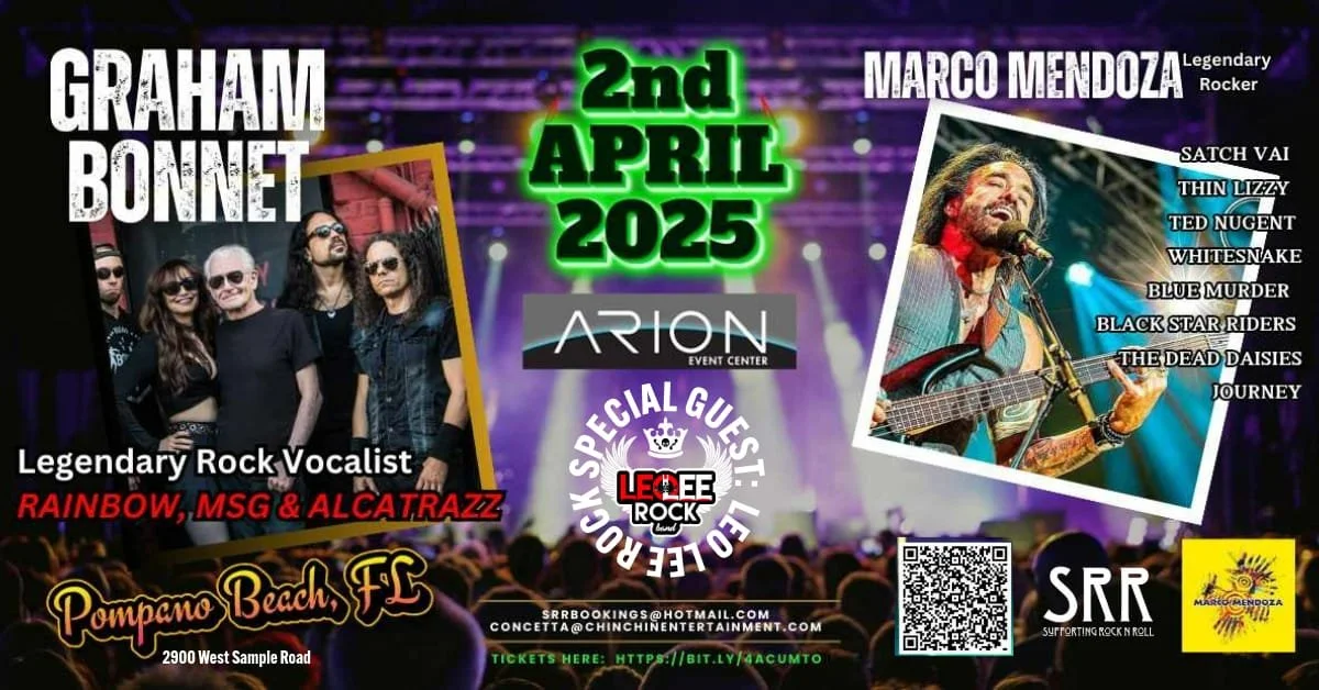 Rock Legends Graham Bonnet & Marco Mendoza live in Pompano Beach! A night of iconic hits & powerhouse performances. Get tickets now!